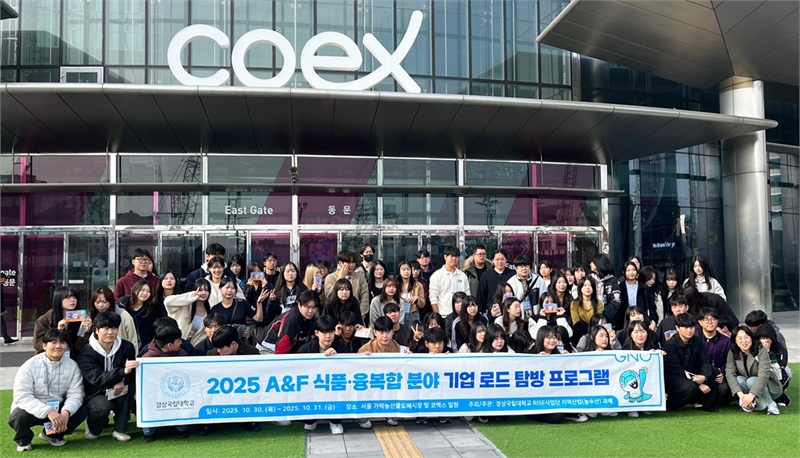 경상국립대 ‘2025 A&F(농수산) 식품·융복합 분야 기업 로드 탐방 프로그램’ 참여 학생들이 서울 강남구 삼성동 코엑스에서 단체 기념사진을 찍고 있다. 경상국립대