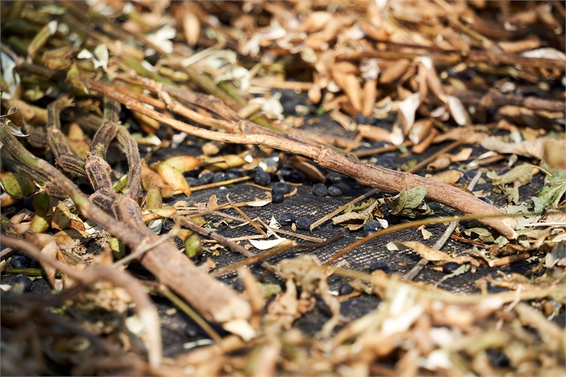 도리깨가 공중에서 돈 힘(가속도)으로 콩대를 내리쳐 꽁깍지와 알곡(콩)을 분리한 모습. 검은 콩 서리태가 콩깍지에서 나와 있다.