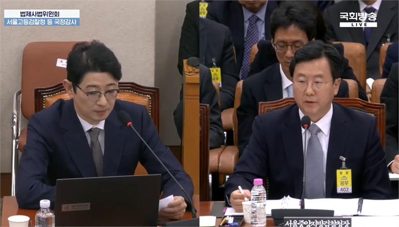 정진우 서울중앙지검장(오른쪽)이 지난 10월 23일 서울 여의도 국회 법제사법위원회에서 열린 서울중앙지검 등에 대한 국정감사에 출석해 주진우 의원 질의를 듣고 있다. 국회방송