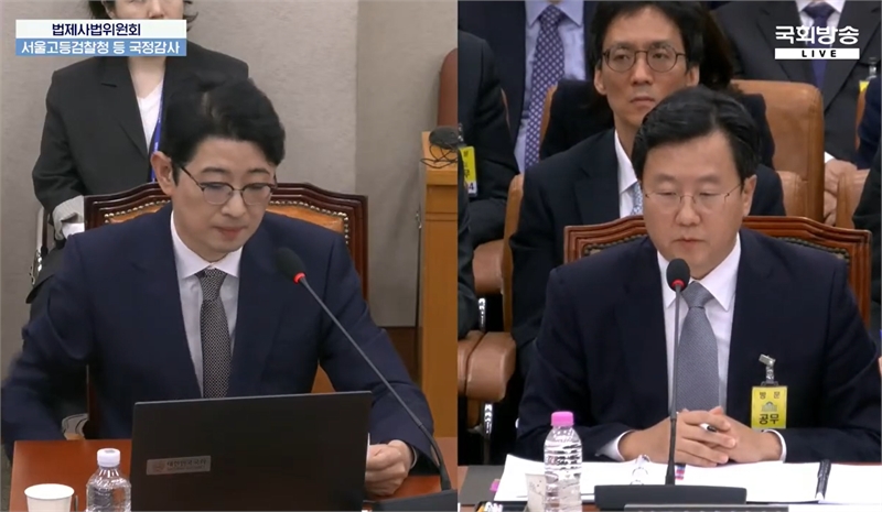 주진우 의원(왼쪽)이 지난 21일 진행된 국회 서울고법과 지법 국정감사에서 정진우 서울중앙지검장의 답변을 듣고 있다. 정 지검장은 8일 경기 성남시 '대장동 개발 비리 사건 항소 포기' 책임을 지겠다며 사임을 발표했다, 국회방송