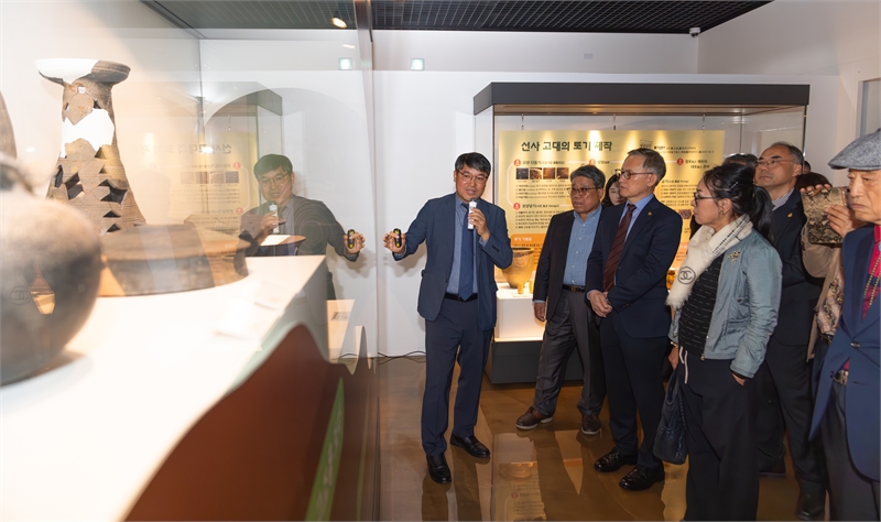 경상국립대박물관이 개교 77주년(건학 115주년)을 맞아 11일 개막한 '돌과 흙에 깃든 사람살이(The Human Story in Stone and Clay)' 특별전시회 모습. 권진회 경상국립대 총장 등이 전시품 설명을 듣고 있다. 경상국립대