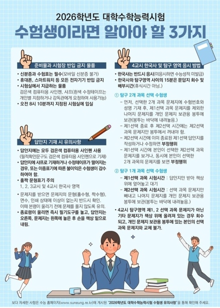 자세한 내용은 대학수학능력시험 누리집(https://www.suneung.re.kr)에 게시된 ‘2026학년도 대학수학능력시험 수험생 유의 사항’에서 확인할 수 있다.