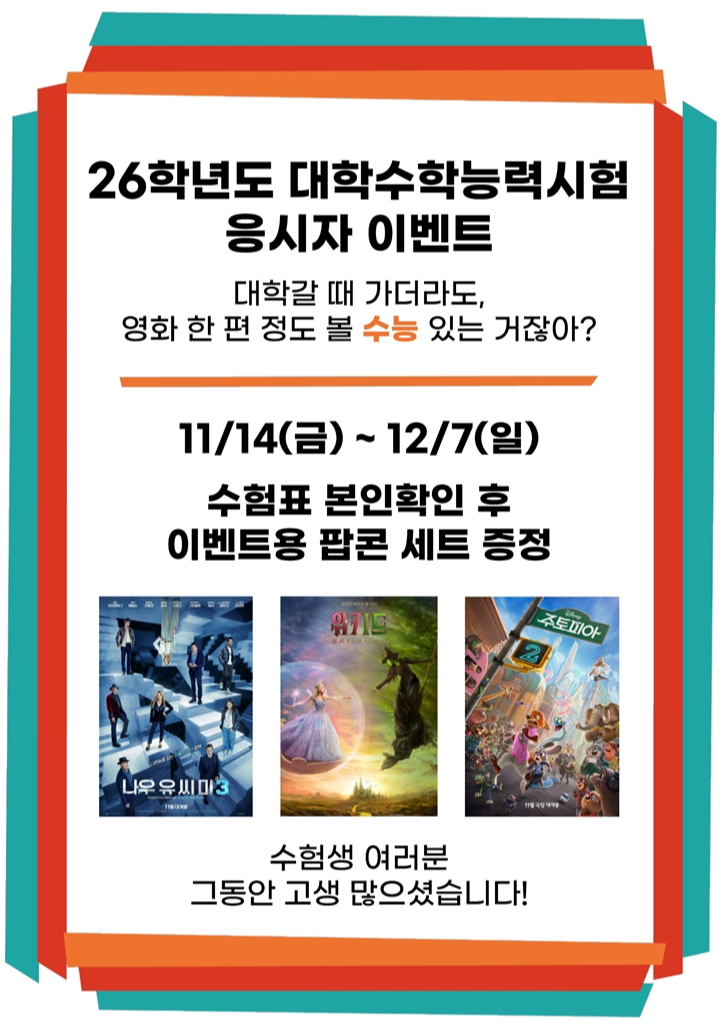 수험표를 지참한 수험생이 매표소에서 본인을 확인하면 팝콘 세트(미니팝콘, 탄산음료)가 제공된다.