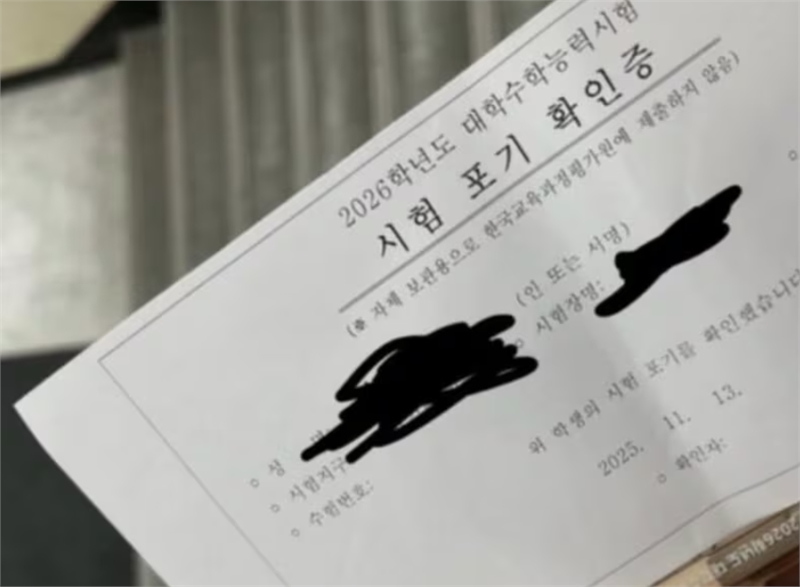 13일 오전 9시30분 올라온 2026학년도 수능 시험 포기 확인증. 온라인 커뮤니티