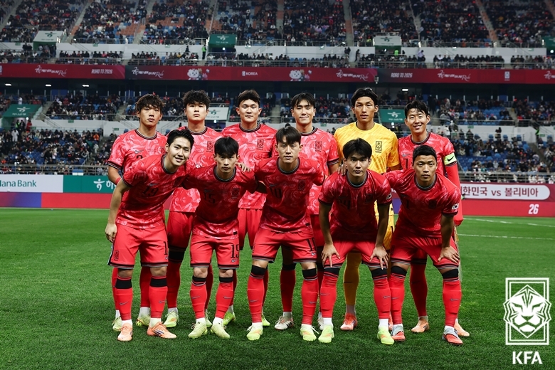 14일 대전월드컵경기장에서 열린 볼리비아와의 친선경기에 선발로 나선 남자 축구 국가대표팀 선수들이 단체 사진을 찍고 있다. 이상 대한축구협회