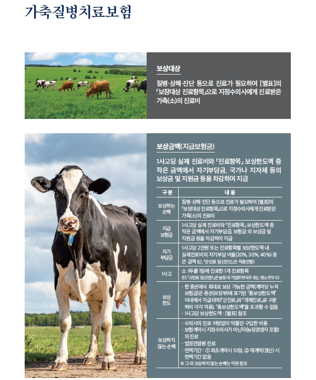 가축질병치료보험 지원 사업은 가축질병으로 인한 축산농가 경제적 손실 예방과 농가 생산성을 높이기 위해 가축질병치료보험(보험사 NH농협손해보험)에 가입한 농가의 보험료를 최대 80%를 지원해 주는 제도이다.
