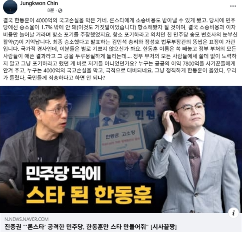 진 교수는 이날 페이스북 글에서 "결국 한동훈이 4000억의 국고손실을 막은 것"이라고 했다.