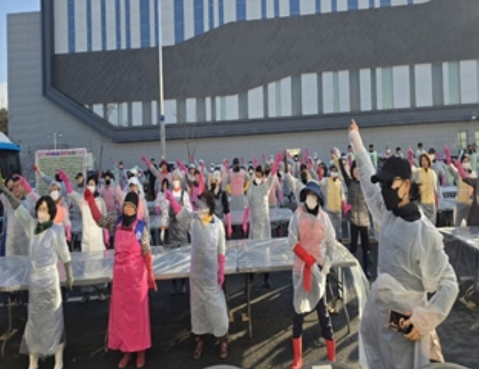 경남 고성군의 각 직능 단체 회원들이 2024년 11월 고성군종합경기장 뜰에서 김장에 앞서 몸 풀기 체조를 하고 있다. 고성군