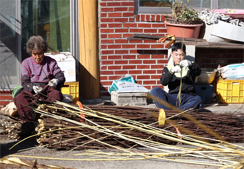 22일 열린 '2025년 무형유산 한지장 공개행사'에서 함양군 창원마을 공동체 주민이 닥나무 껍질을 벗기고 있다.