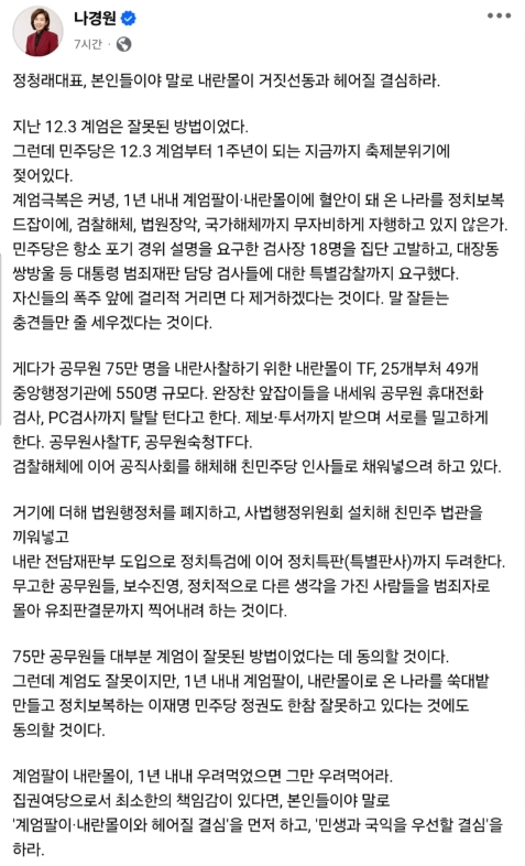 나 의원은 "75만 공무원들 대부분 계엄이 잘못된 방법이었다는 데 동의할 것"이라며 "그런데 계엄도 잘못이지만, 1년 내내 계엄팔이, 내란몰이로 온 나라를 쑥대밭 만들고 정치보복하는 이재명 민주당 정권도 한참 잘못하고 있다는 것에도 동의할 것"이라고 강조했다.