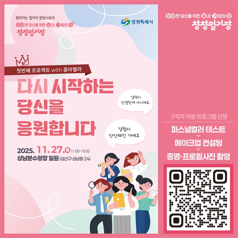 박진열 창원시 경제일자리국장은 “일자리 팝업스토어에 시민들이 부담 없이 찾아와 기업과 자유롭게 이야기를 나누고, 힐링과 정보를 함께 얻어가기를 바란다”며 “내년에도 다양한 구직자들을 대상으로 ‘창창일기장’을 더욱 확대해 나가겠다”고 말했다.