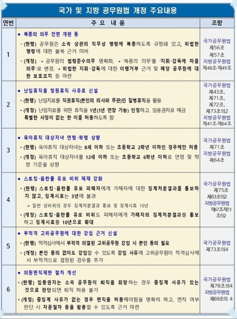 행정안전부와 인사혁신처는 25일 이런 내용이 담긴 국가공무원법 및 지방공무원법 개정안을 입법예고한다고 밝혔다. 개정안은 이날부터 12월 22일까지 입법예고를 거쳐 국회에 제출된다. 국회 심의 절차 등을 감안하면 내년 상반기에 시행될 전망이다.