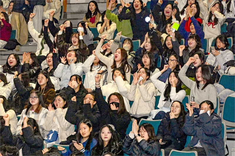 수험생들이 공연에 환호하며 즐기고 있다. 이상 진주시