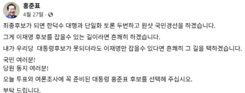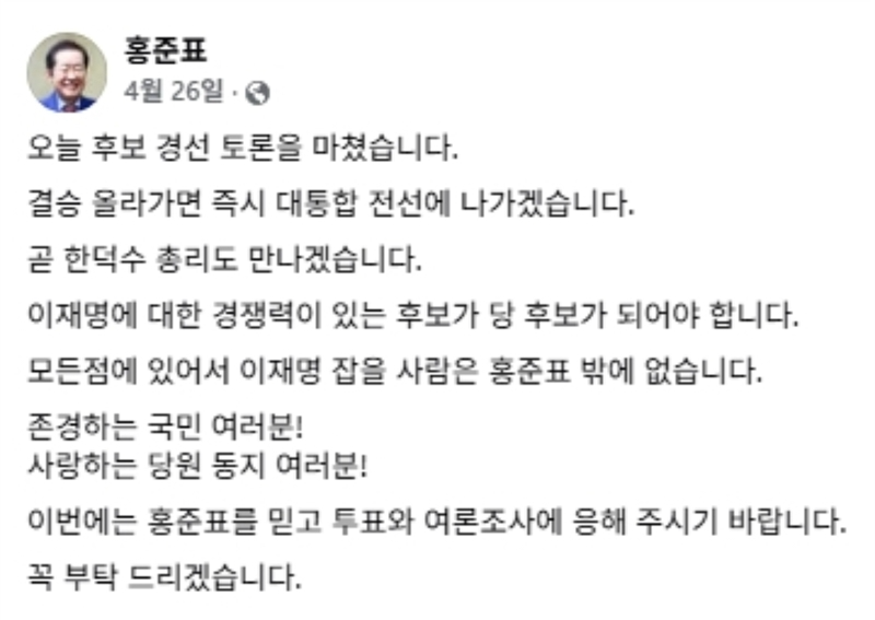 홍 전 시장은 4월 26일 오후 9시 5분쯤 페이스북에 "결승 올라가면 대통합 전선에 나가겠다. 곧 한덕수 총리도 만나겠다"고 했다.