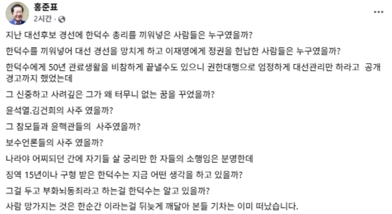 홍 전 시장은 전날 한덕수 전 국무총리가 내란 방조 등 혐의로 징역 15년을 구형 받자 27일 "나라야 어찌되던 간에 자기들 살 궁리만 한 자들"이라고 한 전 총리를 비판했다.