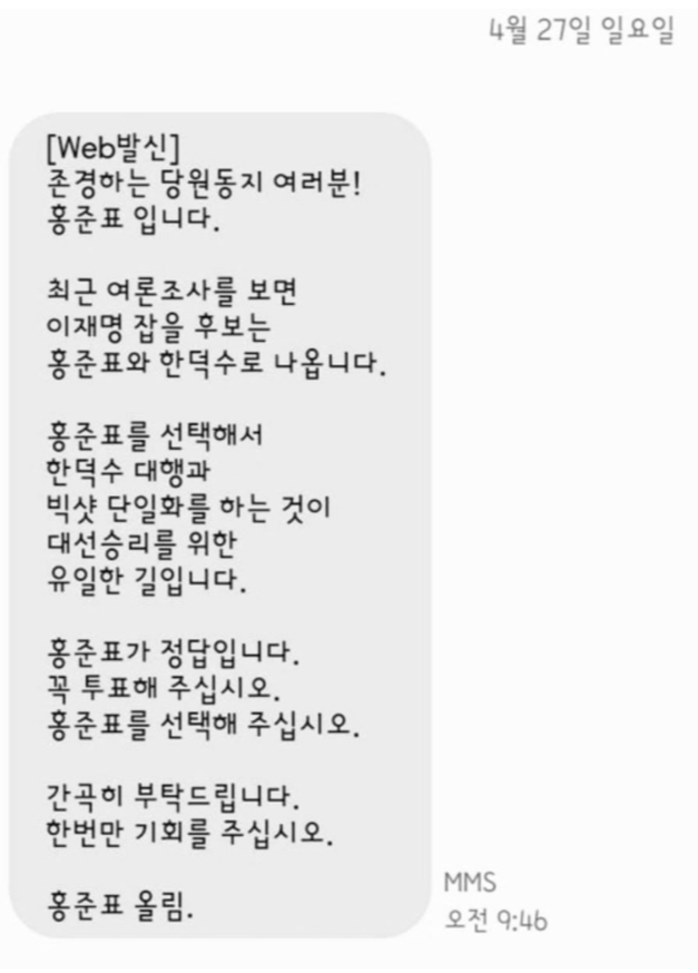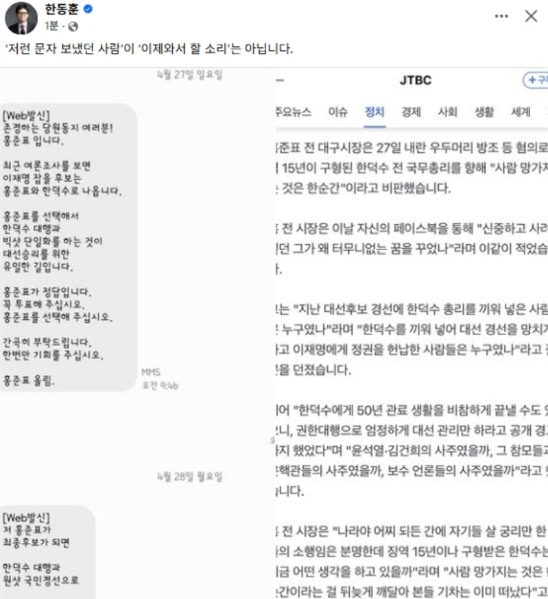 이에 한 전 대표가 홍 전 시장이 21대 대선 경선 때인 지난 4월 27일과 28일 당원들에게 배포한 문자메시지 내용을 공개하며 "저런 문자 보냈던 사람이 이제와서이제와서 할 소리는 아니다"라고 직격했다.