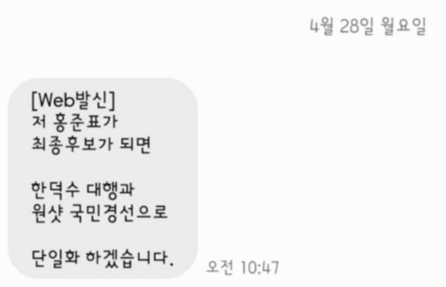 한 전 대표가 공개한 문자메시지는 "최근 여론조사를 보면 이재명 잡을 후보는 홍준표와 한덕수로 나옵니다. 홍준표를 선택해서 한덕수 대행과 빅샷 단일화를 하는 것이 대선 승리를 위한 유일한 길입니다"와 "저 홍준표가 최종 후보가 되면 한덕수 대행과 원샷 국민경선으로 단일화하겠습니다" 등이다.