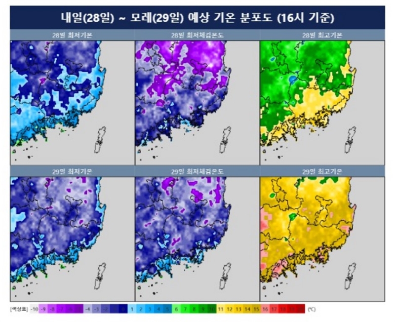 - 29일 아침 최저기온은 부산 4℃, 울산 1℃, 경남 -4~3℃로 평년(-2~6℃)보다 1~4℃ 낮겠고, 낮 최고기온은 부산 16℃, 울산 15℃, 경남 14~15℃로 평년(11~14℃)보다 1~3℃ 높겠습니다.