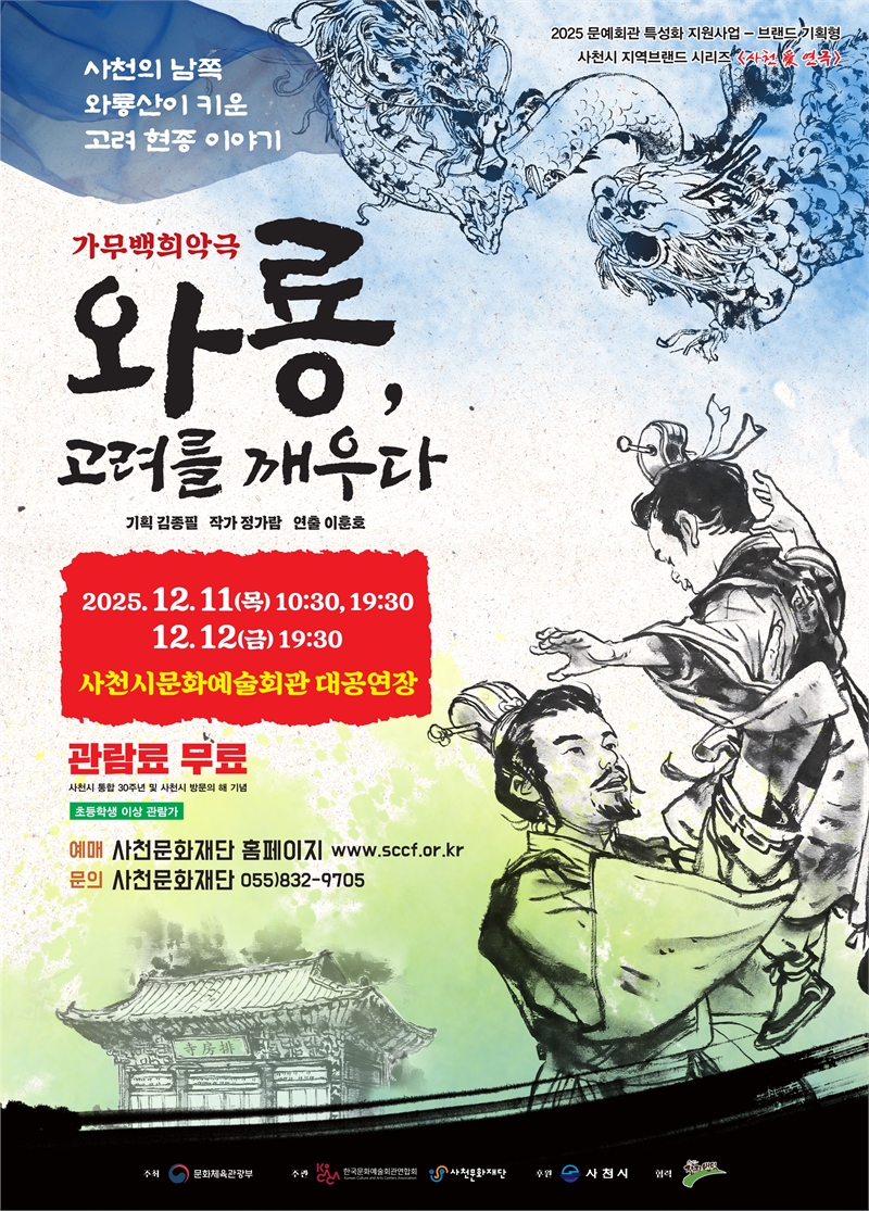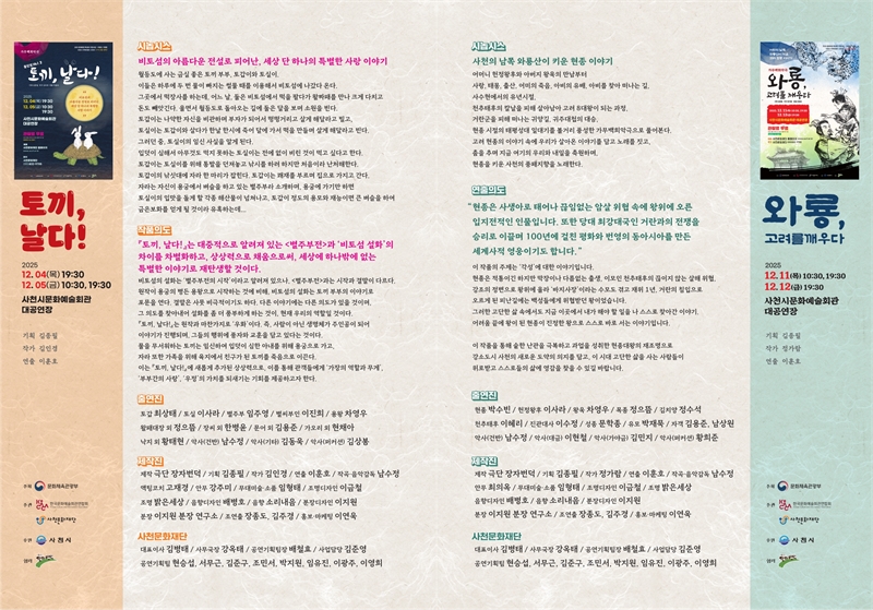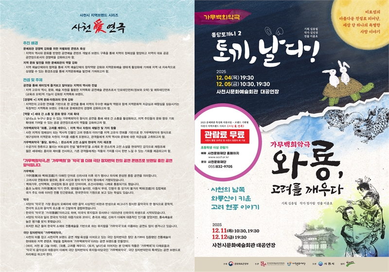 경남 사천문화재단이 사천 브랜드 시리즈 '사천 愛 연극' 두 편을 무대에 올린다. 오는 12월 4~5일에 가무백희악극 '토끼, 날다!'를, 12월 11~12일 가무백희악극 '와룡, 고려를 깨우다'를 선보인다.