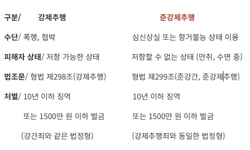 다시 말해 강제추행은 폭행이나 협박을 통해 상대방의 의사에 반해, 즉 동의없이 성적 수치심, 모욕감 등을 주는 불필요한 신체 접촉을 하는 것이고, 준강제추행은 상대방의 심신 상실이나 항거 불능의 상태를 이용해 추행을 하는 것입니다.