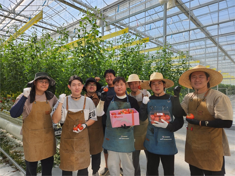청년농업인들이 스마트팜에서 단체 기념사진을 찍고 있다.