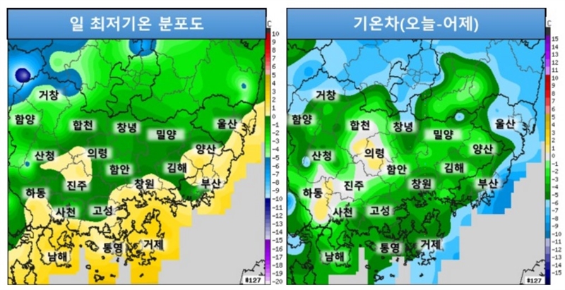 - 3일 낮 최고기온은 부산 7℃, 울산 5℃, 경남 2~7℃로 어제(2일, 10~14℃)보다 4~8℃ 낮겠으며, 평년(10~13℃)보다 4~8℃ 낮겠습니다.