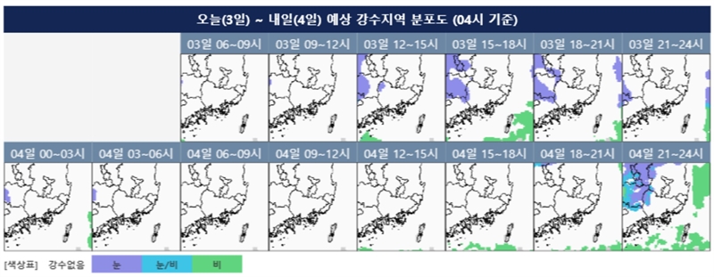 ○ 3일 낮(12~15시)부터 저녁(18~21시) 경남서부내륙(거창, 함양, 산청, 하동)에는 가끔 눈이 내리는 곳이 있겠습니다.