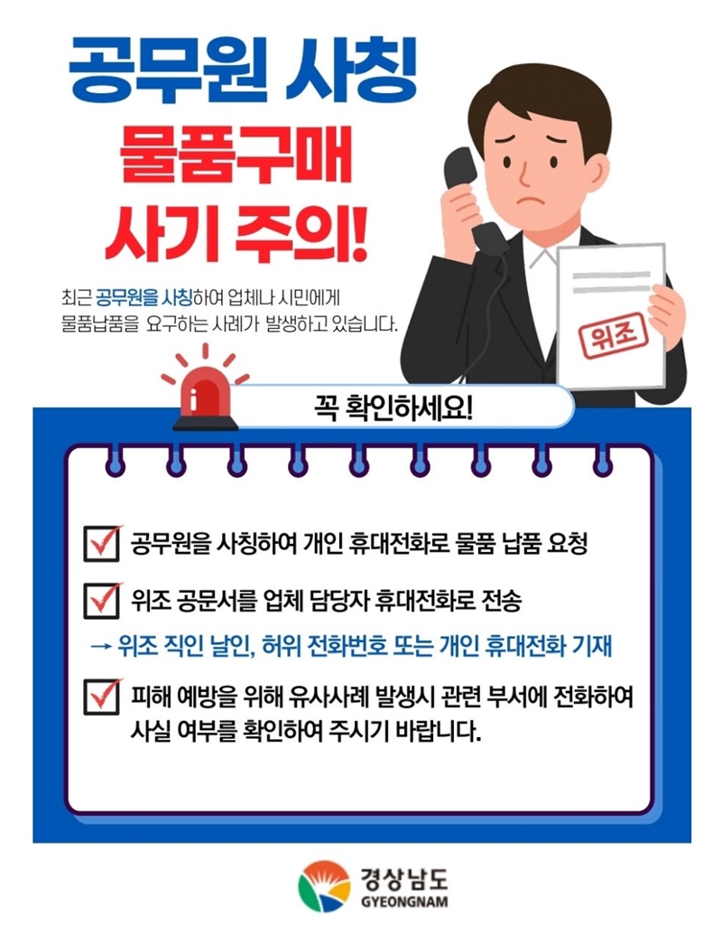 경남도 관계자는 “공무원은 어떠한 사유로도 업체나 개인에게 물품 대리 구매나 금전 송금을 요구하지 않는다”며 “실제 존재하는 업체를 사칭하는 등 수법이 갈수록 지능화되는 만큼 의심되는 연락을 받으면 반드시 기관에 확인해달라”고 당부했다.
