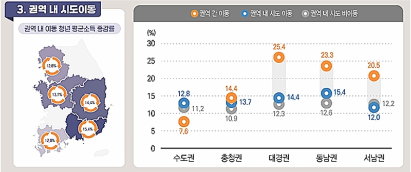 권역별로 대구경북권에서 이동한 청년의 소득 증가율이 25.4%로 가장 높았다. 이어 동남권은 23.3%, 서남권은 20.5%, 충청권은 14.4%였다.