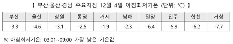 부산지방기상청은 3일 부산 첫 얼음이 관측됐다고 4일 발표했다. 이는 지난해보다 5일 빠르고, 평년보다 9일 늦은 것이다. 3일 부산 첫 얼음 모습. 부산기상관측소 또 부산·울산·경남은 대체로 맑은 가운데, 밤 사이 복사냉각이 더해져 4일 아침 기온이 전날보다 1~5도가량 더 떨어지면서 올겨울 들어 가장 낮은 기온을 보였다. 1 0 더경남뉴스 천진영 기자 hangawi6@naver.com 천진영 기자의 기사 더보기 저작권자 ⓒ 더경남뉴스