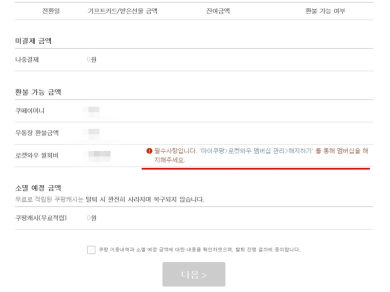 특히 탈퇴 신청 때 쿠팡 캐시나 포인트가 남아 있으면 탈퇴가 불가능하다.