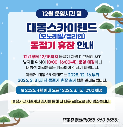 경남 함양군 대봉산휴양밸리는 8일 대봉스카이랜드(모노레일, 집라인) 전 코스를 오는 12월 16일부터 내년 3월 31일까지 운영을 중단한다고 밝혔다.