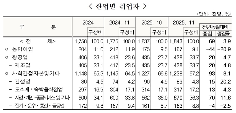특히 제조업 취업자는 전년 동월 대비 2만 명(+4.8%) 증가해 전반적인 고용 회복을 뒷받침했고, 사업·개인·공공서비스업 취업자 수는 7만 명(+11.6%) 늘었다.