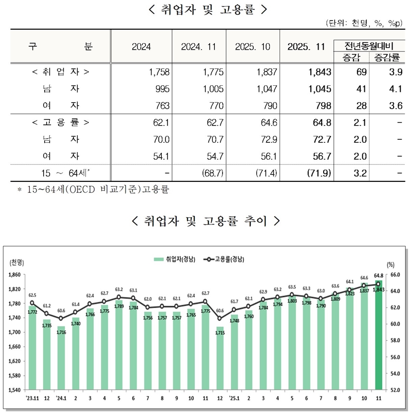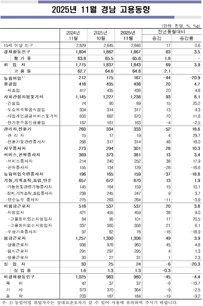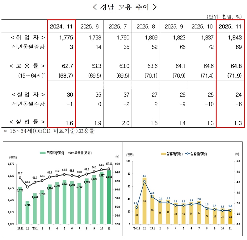 동남지방통계청이 지난 10일 발표한 ‘11월 경남도 고용동향’에 의하면 경남의 11월 고용률은 전년 동월보다 2.1%p 높은 64.8%, 경제활동참가율은 65.6%(전년 동월 대비 +1.8%p)며, 취업자 수는 184만 3천 명으로 전년 동월보다 6만 9천 명(+3.9%)이 증가하는 등 견고한 고용 흐름이 지속됐다.